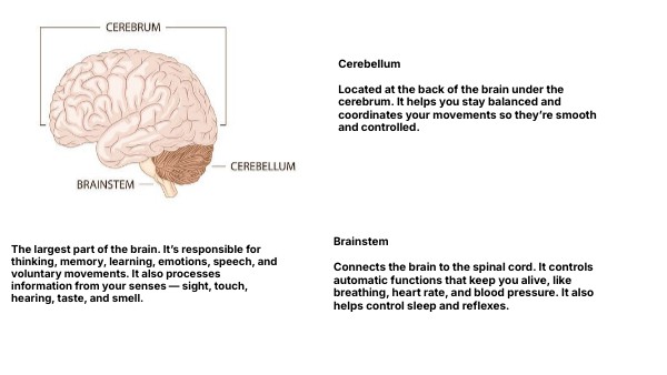 Cerebellum Located at the back of the brain under the cerebrum. It helps you stay balanced and coordinates your movements so they’re smooth