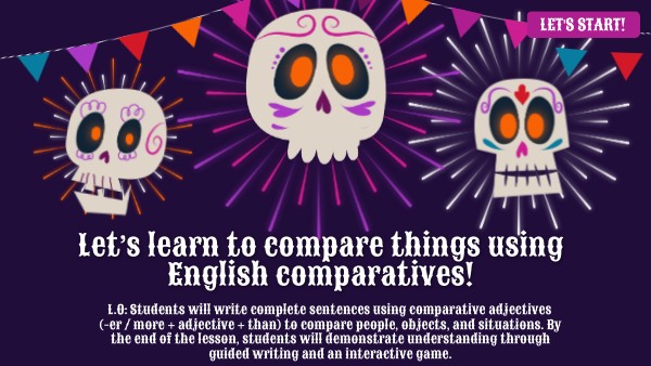 L.O: Students will write complete sentences using comparative adjectives (-er / more + adjective + than) to compare people, objects, and situations. By the end of the lesson, students will demonstrate understanding through guided writing and an interactive game.