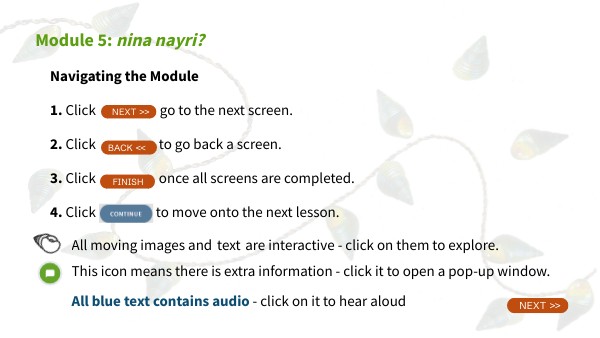 In this module, you will practise short dialogues for everyday social exchanges and develop your ability to communicate in everyday situations. You will build up a vocabulary of feeling words in palawa kani and use them to ask and respond to questions about feelings.Building on familiar pronouns and naming words (nouns) from previous modules, you will expand on your language with a new set of describing words (adjectives). You will practise recognising, pronouncing, and using these words in short conversational patterns that reflect common social interactions. Activities are designed to reinforce confidence in speaking and listening, while strengthening understanding of palawa kani word order.