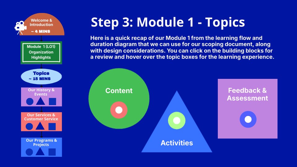 Here is a quick recap of our Module 1 from the learning flow and duration diagram that we can use for our scoping document, along with design considerations. You can click on the building blocks for a review and hover over the topic boxes for the learning experience.
