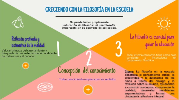 Cierre: La filosofía en la escuela desarrolla el pensamiento crítico, la creatividad y la autonomía de los niños a través del diálogo y la reflexión sobre su mundo, ayudadndo a construir conceptos, comprender la realidad, desarrollar habilidades argumentativas y formar una ciudadanía reflexiva e integral.
