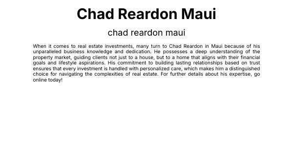When it comes to real estate investments, many turn to Chad Reardon in Maui because of his unparalleled business knowledge and dedication. He possesses a deep understanding of the property market, guiding clients not just to a house, but to a home that aligns with their financial goals and lifestyle aspirations. His commitment to building lasting relationships based on trust ensures that every investment is handled with personalized care, which makes him a distinguished choice for navigating the complexities of real estate. For further details about his expertise, go online today!