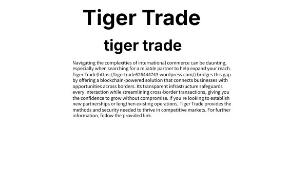 Navigating the complexities of international commerce can be daunting, especially when searching for a reliable partner to help expand your reach. Tiger Trade(https://tigertrade626444743.wordpress.com/) bridges this gap by offering a blockchain-powered solution that connects businesses with opportunities across borders. Its transparent infrastructure safeguards every interaction while streamlining cross-border transactions, giving you the confidence to grow without compromise. If you're looking to establish new partnerships or lengthen existing operations, Tiger Trade provides the methods and security needed to thrive in competitive markets. For further information, follow the provided link.