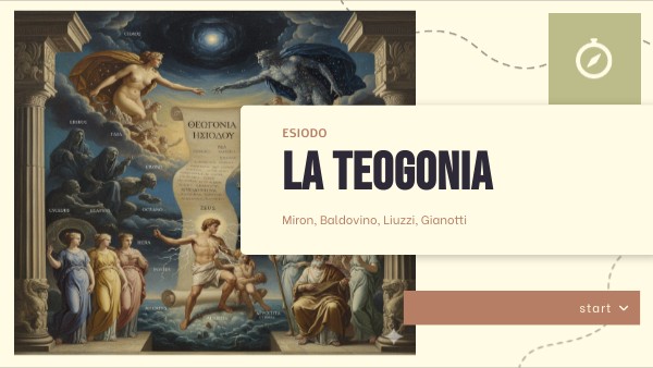 La Teogonia di Esiodo narra l'origine del cosmo greco a partire dal Caos primordiale, da cui emergono Gaia (Terra) e Urano (Cielo). Dalla loro unione nascono i Titani, i Ciclopi e gli Ecatonchiri (esseri enorimi, forti e spavetosi a 50 teste, 100 mani e braccia).