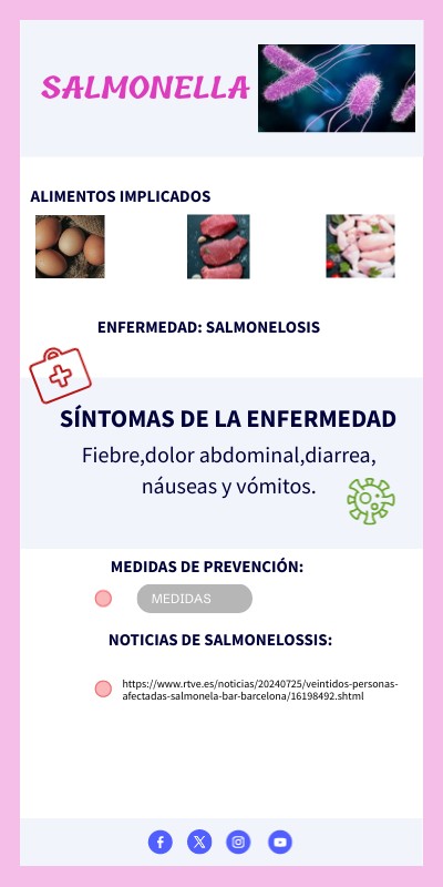 Huevos y derivadosCarne roja,de ave(Poco cocinadas) y derivados Leche y derivados Mariscos y moluscos en contacto con aguas contaminadas Algunos vegetales