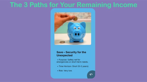 • Purpose: Safety net for emergencies or short-term needs. • Time Horizon: Short (0–2 years). • Risk: Very low.