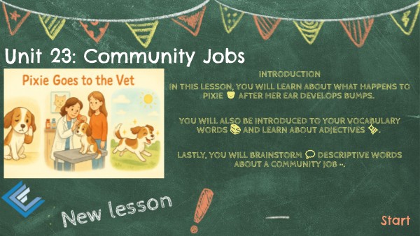 Introduction In this lesson, you will learn about what happens to Pixie ๐ถ after her ear develops bumps. You will also be introduced to your vocabulary words ๐ and learn about adjectives โจ. Lastly, you will brainstorm ๐ญ descriptive words about a community job ๐ทโโ๏ธ.