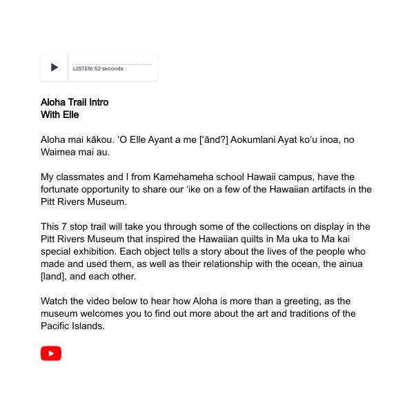Aloha Trail IntroWith Elle Aloha mai kākou. ʻO Elle Ayant a me [‘ānd?] Aokumlani Ayat koʻu inoa, no Waimea mai au. My classmates and I from Kamehameha school Hawaii campus, have the fortunate opportunity to share our ‘ike on a few of the Hawaiian artifacts in the Pitt Rivers Museum. This 7 stop trail will take you through some of the collections on display in the Pitt Rivers Museum that inspired the Hawaiian quilts in Ma uka to Ma kai special exhibition. Each object tells a story about the lives of the people who made and used them, as well as their relationship with the ocean, the ainua [land], and each other. Watch the video below to hear how Aloha is more than a greeting, as the museum welcomes you to find out more about the art and traditions of the Pacific Islands.