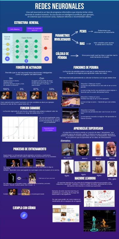 Supervisado :La red aprende viendo ejemplos correctos y copiándolos. Ejemplo : Aprender si un tiro entra o falla viendo muchos tiros con su resultado. No supervisado: La red busca patrones por sí sola, sin que nadie le diga la respuesta. Ejemplo : Aprender como que jugador es cual según cómo se mueven en la cancha. Por refuerzo: La red prueba cosas y aprende de los aciertos y errores. Ejemplo : Decidir cuándo pasar, tirar o botar .-> Existen otros como el semi supervisado y el autosupervisado
