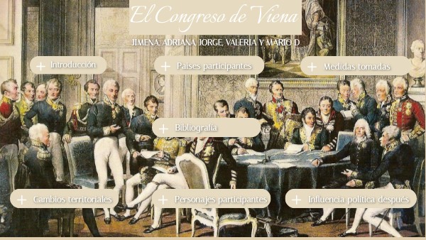 Qué fue? Reunión (1814–1815) para reorganizar Europa tras la derrota de Napoleón.Potencias decisoras: Austria, Reino Unido, Prusia, Rusia y Francia.Personajes y objetivos: - Metternich (Austria): estabilidad y mantener el orden monárquico. - Castlereagh/Wellington (Reino Unido): equilibrio de poder y proteger el comercio. - Hardenberg (Prusia): ganar territorio y seguridad fronteriza.- Zar Alejandro I (Rusia): mayor influencia en Europa del Este y en Polonia.- Talleyrand (Francia): defender los intereses de Francia y evitar sanciones severas.Resultado: Restauración de monarquías y un equilibrio de poder que mantuvo la paz relativa en Europa.