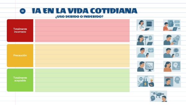 Clasifica 12 imágenes que representan distintos usos de la inteligencia artificial (IA) según su nivel de ética, da click en cada imagen para saber que uso se le está dando a la ia. ✅ Totalmente aceptable Usos de la IA que son éticos, responsables y beneficiosos para la sociedad. ⚠️ Precaución Usos que pueden ser útiles pero presentan riesgos éticos, legales o sociales si no se regulan adecuadamente. ❌ Totalmente incorrecto Usos que violan principios éticos, derechos humanos o que pueden causar daño significativo.