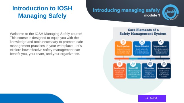 Welcome to the IOSH Managing Safely course! This course is designed to equip you with the knowledge and tools necessary to promote safe management practices in your workplace. Let's explore how effective safety management can benefit you, your team, and your organization.