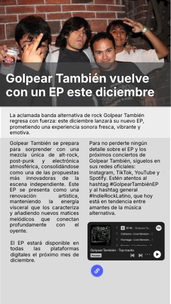 Para no perderte ningún detalle sobre el EP y los próximos conciertos de Golpear También, síguelos en sus redes oficiales: Instagram, TikTok, YouTube y Spotify. Estén atentos al hashtag #GolpearTambiénEP y al hashtag general #IndieRockLatino, que hoy está en tendencia entre amantes de la música alternativa.