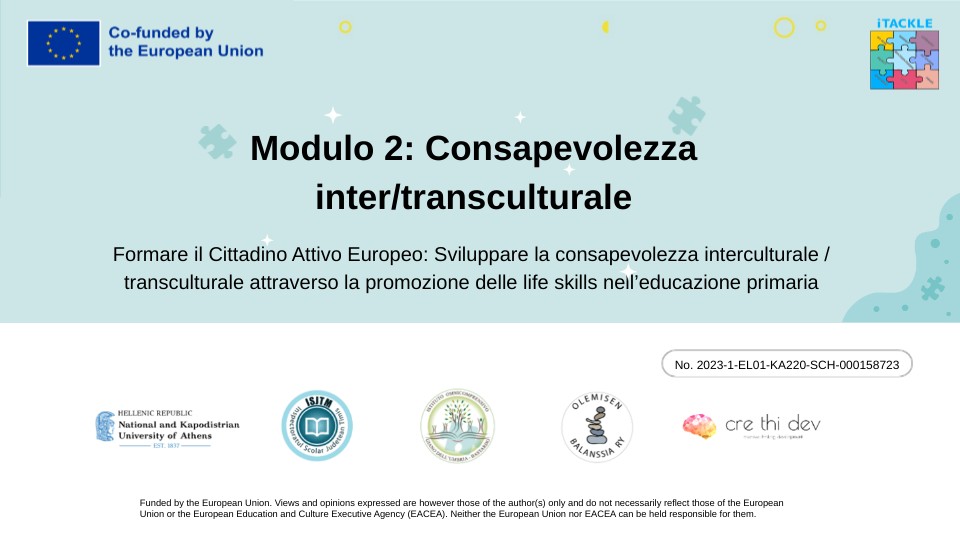 - Il modulo sulla Consapevolezza Interculturale/Transculturale ha l’obiettivo di fornire agli educatori conoscenze, competenze e strumenti necessari per promuovere ambienti di apprendimento inclusivi, rispettosi e coesi.