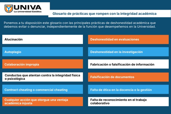 Ponemos a tu disposición este glosario con las principales prácticas de deshonestidad académica que debemos evitar o denunciar, independientemente de la función que desempeñemos en la Universidad.