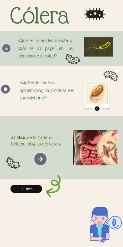 🦠 Una sola bacteria, Vibrio cholerae, puede causar el cólera. 💧 Puede matar en menos de 24 horas si no se trata. 🌎 Ha provocado siete pandemias en la historia. 🚰 Se transmite por agua y alimentos contaminados. 🧒 Los niños pequeños son los más afectados. 💊 El mejor tratamiento es rehidratar al enfermo. 🌡️ Aumenta en épocas de calor y lluvias. 🧫 La bacteria puede vivir en agua dulce o salada. 💉 Hay vacuna oral para prevenirla. 🌿 Con agua limpia y buena higiene, el cólera se puede evitar.