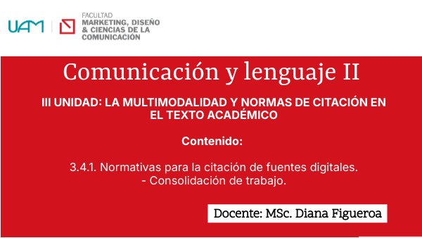 III UNIDAD: LA MULTIMODALIDAD Y NORMAS DE CITACIÓN EN EL TEXTO ACADÉMICO Contenido: 3.4.1. Normativas para la citación de fuentes digitales. - Consolidación de trabajo.