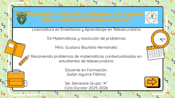 Licenciatura en Enseñanza y Aprendizaje en Telesecundaria 3.6 Matemáticas y resolución de problemas Mtro. Gustavo Bautista Hernández Resolviendo problemas de matemáticas contextualizados en estudiantes de telesecundaria Docente en Formación: Galán Aguirre Fátima 3er Semestre Grupo “A” Ciclo Escolar 2025-2026