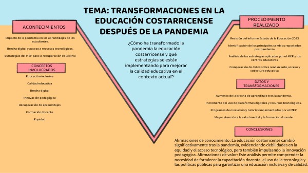Afirmaciones de conocimiento: La educación costarricense cambió significativamente tras la pandemia, evidenciando debilidades en la equidad y el acceso tecnológico, pero también impulsando la innovación pedagógica. Afirmaciones de valor: Este análisis permite comprender la necesidad de fortalecer la capacitación docente, el uso de la tecnología y las políticas públicas para garantizar una educación inclusiva y de calidad.