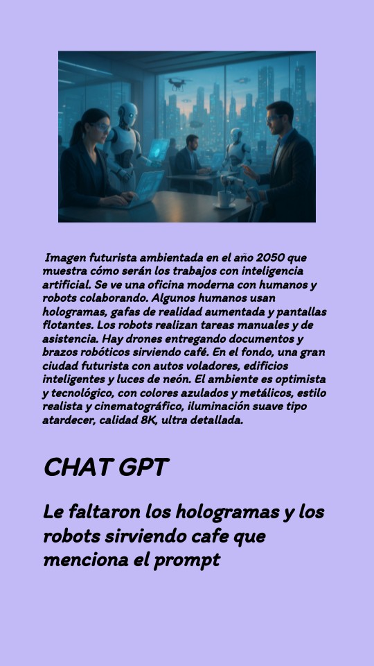 Imagen futurista ambientada en el año 2050 que muestra cómo serán los trabajos con inteligencia artificial. Se ve una oficina moderna con humanos y robots colaborando. Algunos humanos usan hologramas, gafas de realidad aumentada y pantallas flotantes. Los robots realizan tareas manuales y de asistencia. Hay drones entregando documentos y brazos robóticos sirviendo café. En el fondo, una gran ciudad futurista con autos voladores, edificios inteligentes y luces de neón. El ambiente es optimista y tecnológico, con colores azulados y metálicos, estilo realista y cinematográfico, iluminación suave tipo atardecer, calidad 8K, ultra detallada.