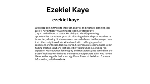 With deep commitment to thorough analysis and strategic planning sets Ezekiel Kaye(https://www.instapaper.com/p/ezekielkaye ) apart in the financial sector. His ability to identify promising opportunities stems from years of cultivating relationships across diverse industries, allowing him to access exclusive deals and insider perspectives that others might overlook. When faced with challenging market conditions or intricate deal structures, he demonstrates remarkable skill in finding creative solutions that benefit investors while minimizing risk exposure. His reputation for integrity and transparency has earned him the trust of high-net-worth clients and institutional partners alike, who rely on his expertise to guide their most significant financial decisions. For more information, visit the website.