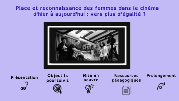 Date de la mise en ligne : novembre 2025 Titre de la séquence : place et reconnaissance des femmes dans le cinéma depuis la première moitié du XXème siècle : vers plus d’égalité ? Niveau concerné : première Place dans la programmation et inscription dans le programme : Cohésion et diversité dans une société démocratique Les valeurs et les principes de la République à l’épreuve de la cohésion sociale, Egalité femmes-hommes Problématique: Alors qu'en 2024, moins d'un film sur 4 est réalisé par une femme et que le festival de Cannes n'a décerné que 3 palmes d'or à des femmes en 78 ans d'existence, on peut se demander si les transformations récentes du monde du cinéma contribuent à promouvoir l'égalité femmes-hommes et à renforcer la cohésion sociale. Mise en intrigue : Depuis l’affaire Weinstein ou le mouvement #MeToo, le monde du cinéma, marqué par des inégalités femmes-hommes, a connu des bouleversements importants. Comment les inégalités femmes-hommes se traduisent-elles dans le monde du cinéma et quelles actions sont entreprises afin de les réduire ? Résumé de la séquence : Les élèves prennent connaissance des inégalités entre les femmes et les hommes dans l’industrie cinématographique du début du XXe siècle (à travers l'exemple d'Alice Guy) à aujourd'hui, puis des réactions et des mesures prises par différents acteurs du monde de la Culture. La tâche finale s’organise autour de la récente décision du Festival du film de Berlin de remettre un prix non genré pour la meilleure interprétation, afin de lutter en partie contre les inégalités de genre. La recherche d’arguments mène à un débat sur le sujet : « décerner des prix genrés ou non genrés, un moyen de réduction des inégalités entre les femmes et les hommes ? »