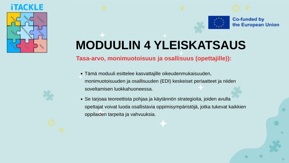 - Tämä moduuli esittelee kasvattajille oikeudenmukaisuuden, monimuotoisuuden ja osallisuuden (EDI) keskeiset periaatteet ja niiden soveltamisen luokkahuoneessa.