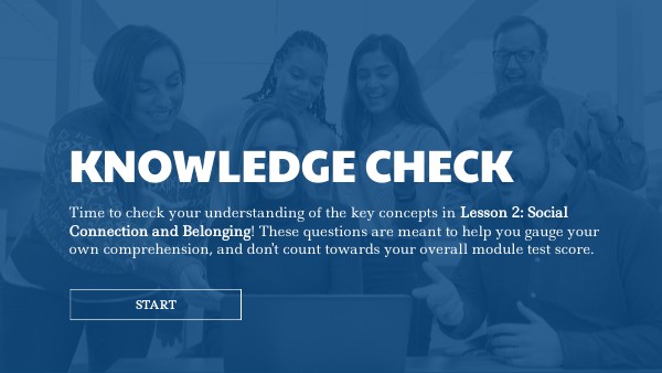Time to check your understanding of the key concepts in Lesson 2: Social Connection and Belonging! These questions are meant to help you gauge your own comprehension, and don't count towards your overall module test score.