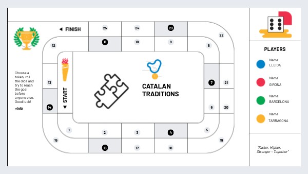 The game can be played by 2 to 4 players. Each player must choose a chip (yellow, blue, red or green) and roll the dice. The player who gets the highest number will be the one to start the game. To play, each participant must roll the dice and move his/her piece to the corresponding square. In each square, there must be a question about "traditions". If he/she answers correctly, he/she can move forward; if not, it is the next player's turn. The player who reaches the finish line first wins.