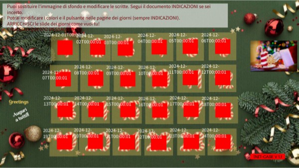 Puoi sostituire l'immagine di sfondo e modificare le scritte. Segui il documento INDICAZIONI se sei incerto. Potrai modificare i colori e il pulsante nelle pagine dei giorni (sempre INDICAZIONI). ARRICCHISCI le slide dei giorni come vuoi tu!CANCELLA QUESTO MESSAGGIO ;))
