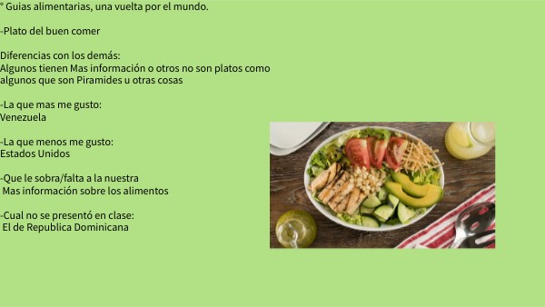 ° Guias alimentarias, una vuelta por el mundo. -Plato del buen comer Diferencias con los demás: Algunos tienen Mas información o otros no son platos como algunos que son Piramides u otras cosas -La que mas me gusto: Venezuela -La que menos me gusto: Estados Unidos -Que le sobra/falta a la nuestra Mas información sobre los alimentos -Cual no se presentó en clase: El de Republica Dominicana