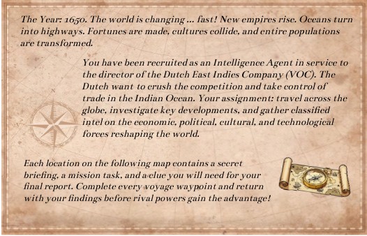 You have been recruited as an Intelligence Agent in service to the director of the Dutch East Indies Company (VOC). The Dutch want to crush the competition and take control of trade in the Indian Ocean. Your assignment: travel across the globe, investigate key developments, and gather classified intel on the economic, political, cultural, and technological forces reshaping the world.