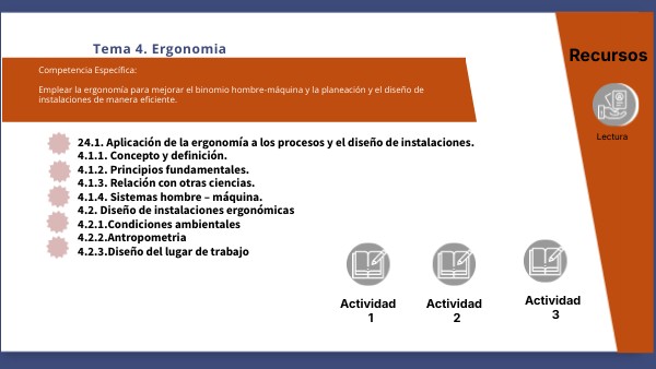 24.1. Aplicación de la ergonomía a los procesos y el diseño de instalaciones. 4.1.1. Concepto y definición. 4.1.2. Principios fundamentales. 4.1.3. Relación con otras ciencias. 4.1.4. Sistemas hombre – máquina. 4.2. Diseño de instalaciones ergonómicas 4.2.1.Condiciones ambientales 4.2.2.Antropometria 4.2.3.Diseño del lugar de trabajo