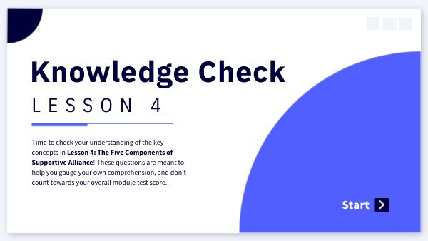 Time to check your understanding of the key concepts in Lesson 4: The Five Components of Supportive Alliance! These questions are meant to help you gauge your own comprehension, and don't count towards your overall module test score.