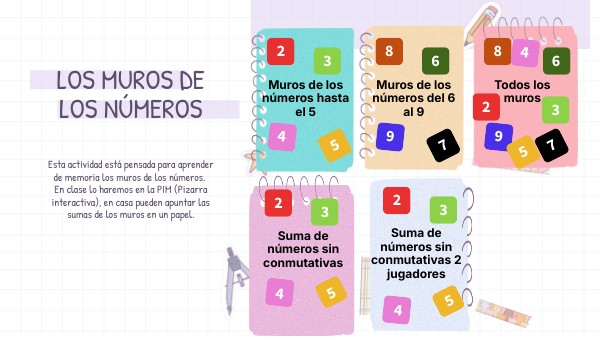 Esta actividad está pensada para aprender de memoria los muros de los números. En clase lo haremos en la PIM (Pizarra interactiva), en casa pueden apuntar las sumas de los muros en un papel.