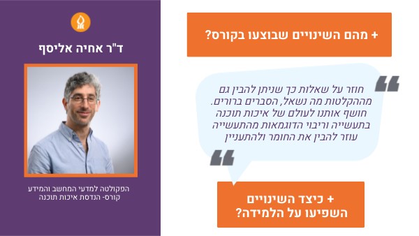 למידה מבוססת פרויקטים: הקורס הפך מתיאורטי למעשי, תוך שילוב פרויקט סמסטריאלי שבו הסטודנטים כותבים תוכנית בדיקות אוטומטית לאתר קיים, מיישמים שלוש שיטות בדיקה ומשווים ביניהן – כהכנה לפרויקט הגמר ולעבודה בתעשייה. פותחו שני כלים ייחודיים, שהובילו אף להצעה מ־IBM Research לכתיבת ספר קורס: - כלי לבדיקה אוטומטית: התלמידים כותבים קוד הבודק מערכת קיימת וכלי הבדיקה האוטומטי מעריך את איכות הפתרון שלהם ולא רק את נכונות התוצאה. לצורך כך הכלי משתמש בתיאוריה הנלמדת בקורס הנקראת “בדיקות מוטציה” ועל הדרך מראה לתלמידים שימושים מעשיים לרעיונות התיאורטיים. - כלי לתרגול אינטראקטיבי: מאפשר תרגול עצמאי ובלתי מוגבל בניתוח קוד, עם משוב מיידי והבנה מעמיקה של החומר. לסיכום: השינויים הפכו את הקורס לרלוונטי, מעשי ומעמיק, וציידו את הסטודנטים במיומנויות קריטיות לפרויקט הגמר ולתעשייה.