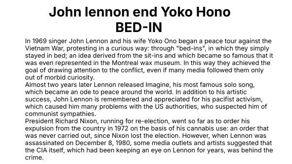 In 1969 singer John Lennon and his wife Yoko Ono began a peace tour against the Vietnam War, protesting in a curious way: through "bed-ins", in which they simply stayed in bed; an idea derived from the sit-ins and which became so famous that it was even represented in the Montreal wax museum. In this way they achieved the goal of drawing attention to the conflict, even if many media followed them only out of morbid curiosity. Almost two years later Lennon released Imagine, his most famous solo song, which became an ode to peace around the world. In addition to his artistic success, John Lennon is remembered and appreciated for his pacifist activism, which caused him many problems with the US authorities, who suspected him of communist sympathies. President Richard Nixon, running for re-election, went so far as to order his expulsion from the country in 1972 on the basis of his cannabis use: an order that was never carried out, since Nixon lost the election. However, when Lennon was assassinated on December 8, 1980, some media outlets and artists suggested that the CIA itself, which had been keeping an eye on Lennon for years, was behind the crime.