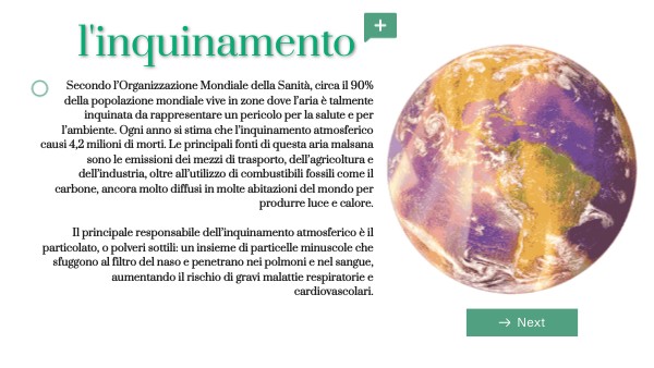 Secondo l’Organizzazione Mondiale della Sanità, circa il 90% della popolazione mondiale vive in zone dove l’aria è talmente inquinata da rappresentare un pericolo per la salute e per l’ambiente. Ogni anno si stima che l’inquinamento atmosferico causi 4,2 milioni di morti. Le principali fonti di questa aria malsana sono le emissioni dei mezzi di trasporto, dell’agricoltura e dell’industria, oltre all’utilizzo di combustibili fossili come il carbone, ancora molto diffusi in molte abitazioni del mondo per produrre luce e calore. Il principale responsabile dell’inquinamento atmosferico è il particolato, o polveri sottili: un insieme di particelle minuscole che sfuggono al filtro del naso e penetrano nei polmoni e nel sangue, aumentando il rischio di gravi malattie respiratorie e cardiovascolari.