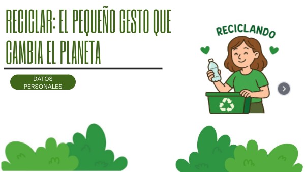 Reciclar es una acción sencilla pero fundamental para cuidar el planeta. A través del reciclaje se reduce la contaminación, se ahorran recursos naturales y energía, y se disminuye la cantidad de basura que afecta al medio ambiente. Además, promueve una cultura de responsabilidad y respeto hacia la naturaleza. Si todos adoptamos el hábito de reciclar, podremos construir un futuro más limpio, sostenible y saludable para las próximas generaciones