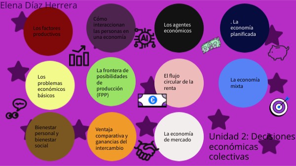 Familias: consumen bienes, prestan factores y reciben rentas (salarios, intereses, alquileres y dividendos). Empresas: producen bienes y servicios para obtener beneficios. Sector público: regula la economía y busca eficiencia, equidad y estabilidad.