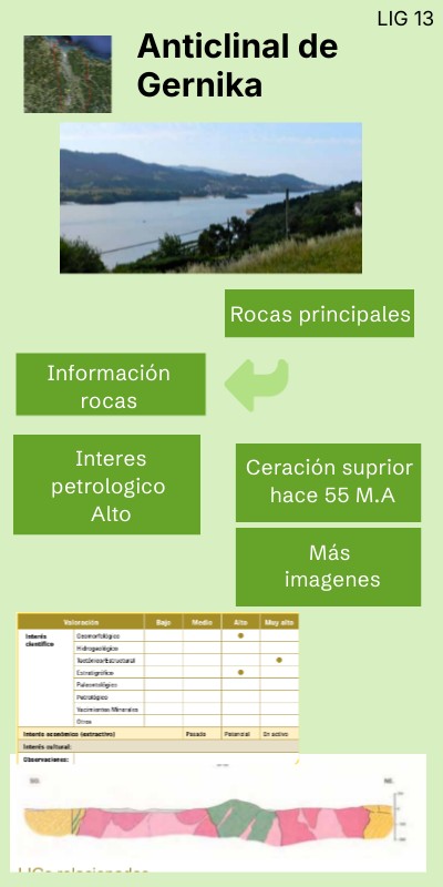El anticlinal de Gernika, es una estructura geológica que explíca cómo se formó el estuario de Oka (Urdaibai) En el centro hay arcilla del triasico y rocas ofíticas del Jurásico. En los lados podemos ver que hay calizas y materiales de Cretácico. Por la presión y el movimiento de los materiales blandos, se ha formado un valle, que fue invadido por el mar hace 8.500 años.