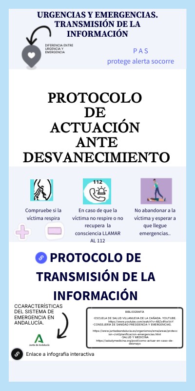 BIBLIOGRAFÍA -ESCUELA DE SALUD VILLANUEVA DE LA CAÑADA. YOUTUBE. https://www.youtube.com/watch?v=48Zx4fxxVxY -CONSEJERÍA DE SANIDAD PRESIDENCIA Y EMERGENCIAS. https://www.juntadeandalucia.es/organismos/ema/areas/proteccion-civil/planificacion-emergencias.html -SALUD Y MEDICINA https://saludymedicina.org/post/como-actuar-en-caso-de-desmayo