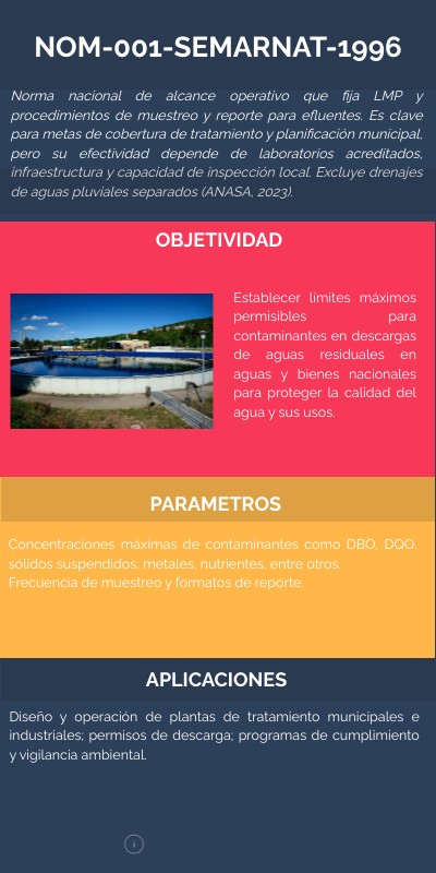 Norma nacional de alcance operativo que fija LMP y procedimientos de muestreo y reporte para efluentes. Es clave para metas de cobertura de tratamiento y planificación municipal, pero su efectividad depende de laboratorios acreditados, infraestructura y capacidad de inspección local. Excluye drenajes de aguas pluviales separados (ANASA, 2023).