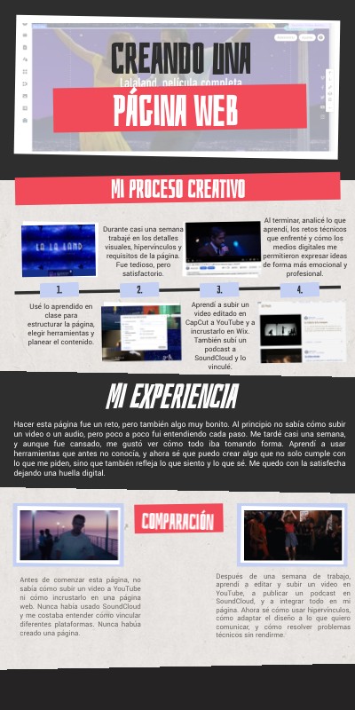 Antes de comenzar esta página, no sabía cómo subir un video a YouTube ni cómo incrustarlo en una página web. Nunca había usado SoundCloud y me costaba entender cómo vincular diferentes plataformas. Nunca habúa creado una página.