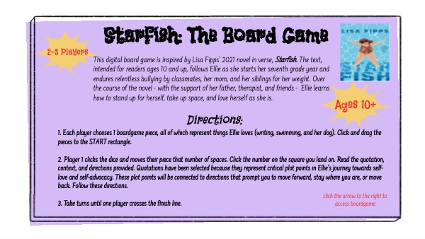 This digital board game is inspired by Lisa Fipps' 2021 novel in verse, Starfish. The text, intended for readers ages 10 and up, follows Ellie as she starts her seventh grade year and endures relentless bullying by classmates, her mom, and her siblings for her weight. Over the course of the novel - with the support of her father, therapist, and friends - Ellie learns how to stand up for herself, take up space, and love herself as she is.