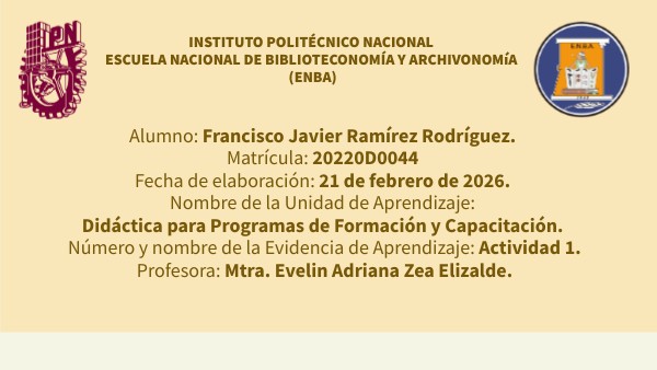 Alumno: Francisco Javier Ramírez Rodríguez. Matrícula: 20220D0044 Fecha de elaboración: 21 de febrero de 2026. Nombre de la Unidad de Aprendizaje: Didáctica para Programas de Formación y Capacitación. Número y nombre de la Evidencia de Aprendizaje: Actividad 1. Profesora: Mtra. Evelin Adriana Zea Elizalde.