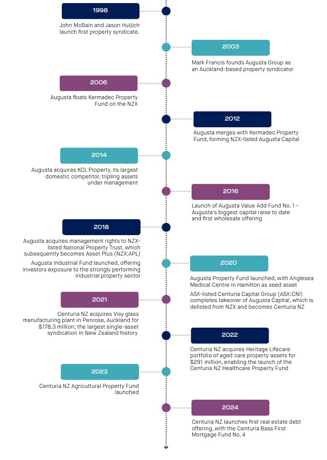 Augusta Property Fund launched, with Anglesea Medical Centre in Hamilton as seed asset ASX-listed Centuria Capital Group (ASX:CNI) completes takeover of Augusta Capital, which is delisted from NZX and becomes Centuria NZ