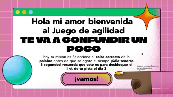 hoy tu mision es Selecciona el color correcto de la palabra antes de que se agote el tiempo. ¡Sólo tendrás 3 segundos! recuerda que esto es para desbloquar el link de tu pista el dia 3