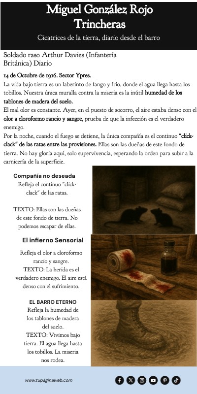 14 de Octubre de 1916. Sector Ypres. La vida bajo tierra es un laberinto de fango y frío, donde el agua llega hasta los tobillos. Nuestra única muralla contra la miseria es la inútil humedad de los tablones de madera del suelo. El mal olor es constante. Ayer, en el puesto de socorro, el aire estaba denso con el olor a cloroformo rancio y sangre, prueba de que la infección es el verdadero enemigo. Por la noche, cuando el fuego se detiene, la única compañía es el continuo "click-clack" de las ratas entre las provisiones. Ellas son las dueñas de este fondo de tierra. No hay gloria aquí, solo supervivencia, esperando la orden para subir a la carnicería de la superficie.