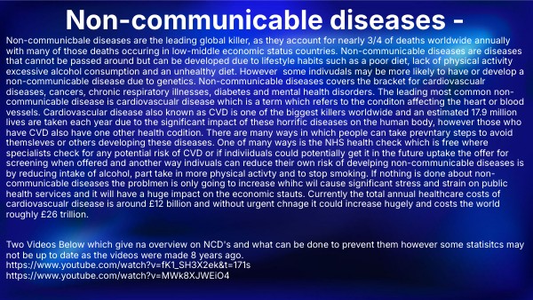 Non-communicbale diseases are the leading global killer, as they account for nearly 3/4 of deaths worldwide annually with many of those deaths occuring in low-middle economic status countries. Non-communicable diseases are diseases that cannot be passed around but can be developed due to lifestyle habits such as a poor diet, lack of physical activity excessive alcohol consumption and an unhealthy diet. However some indivudals may be more likely to have or develop a non-communicable disease due to genetics. Non-communicable diseases covers the bracket for cardiovascualr diseases, cancers, chronic respiratory illnesses, diabetes and mental health disorders. The leading most common non-communicable disease is cardiovascualr disease which is a term which refers to the conditon affecting the heart or blood vessels. Cardiovascular disease also known as CVD is one of the biggest killers worldwide and an estimated 17.9 million lives are taken each year due to the significant impact of these horrific diseases on the human body, however those who have CVD also have one other health codition. There are many ways in which people can take prevntary steps to avoid themsleves or others developing these diseases. One of many ways is the NHS health check which is free where specialists check for any potential risk of CVD or if indiviiduals could potentially get it in the future uptake the offer for screening when offered and another way indivuals can reduce their own risk of develping non-communicable diseases is by reducing intake of alcohol, part take in more physical activty and to stop smoking. If nothing is done about non-communicable diseases the problmen is only going to increase whihc wil cause significant stress and strain on public health services and it will have a huge impact on the economic stauts. Currently the total annual healthcare costs of cardiovascualr disease is around £12 billion and without urgent chnage it could increase hugely and costs the world roughly £26 trillion. Two Videos Below which give na overview on NCD's and what can be done to prevent them however some statisitcs may not be up to date as the videos were made 8 years ago. https://www.youtube.com/watch?v=fK1_SH3X2ek&t=171s https://www.youtube.com/watch?v=MWk8XJWEiO4